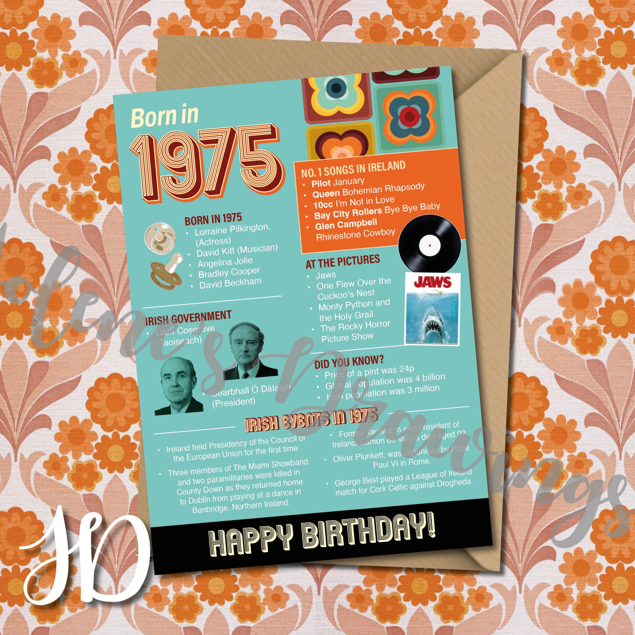 + Free ShippingAs you or your loved one celebrates their 50th birthday this year, let them read all about 1975 in Ireland! A4 folded to A5 card, blank on the inside, c0mes with craft or white envelope.