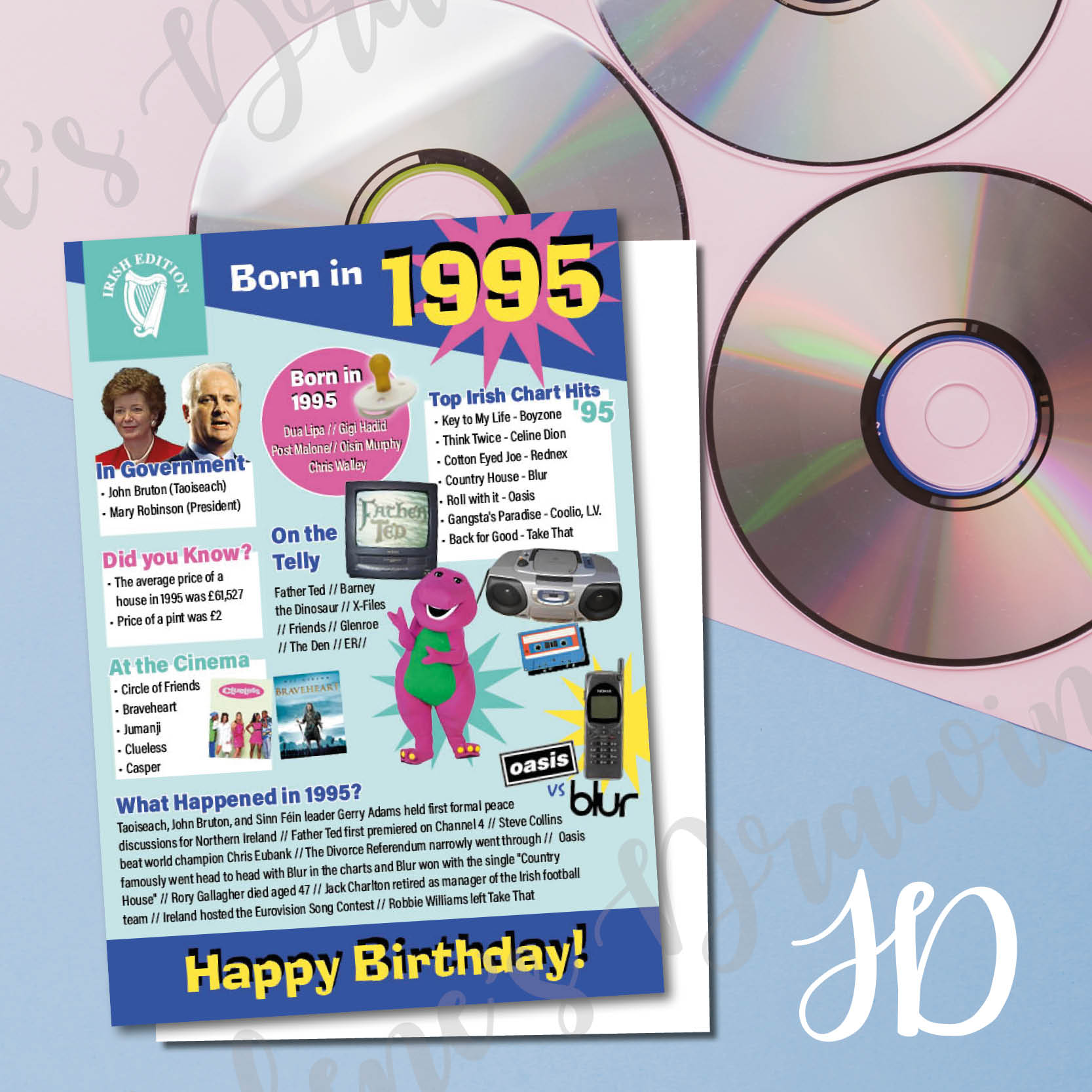 1995 Irish Edition birthday card. As you or your loved one celebrates their 30th birthday this year, let them read all about 1995 in Ireland! A4 folded to A5 card, blank on the inside, c0mes with white envelope.