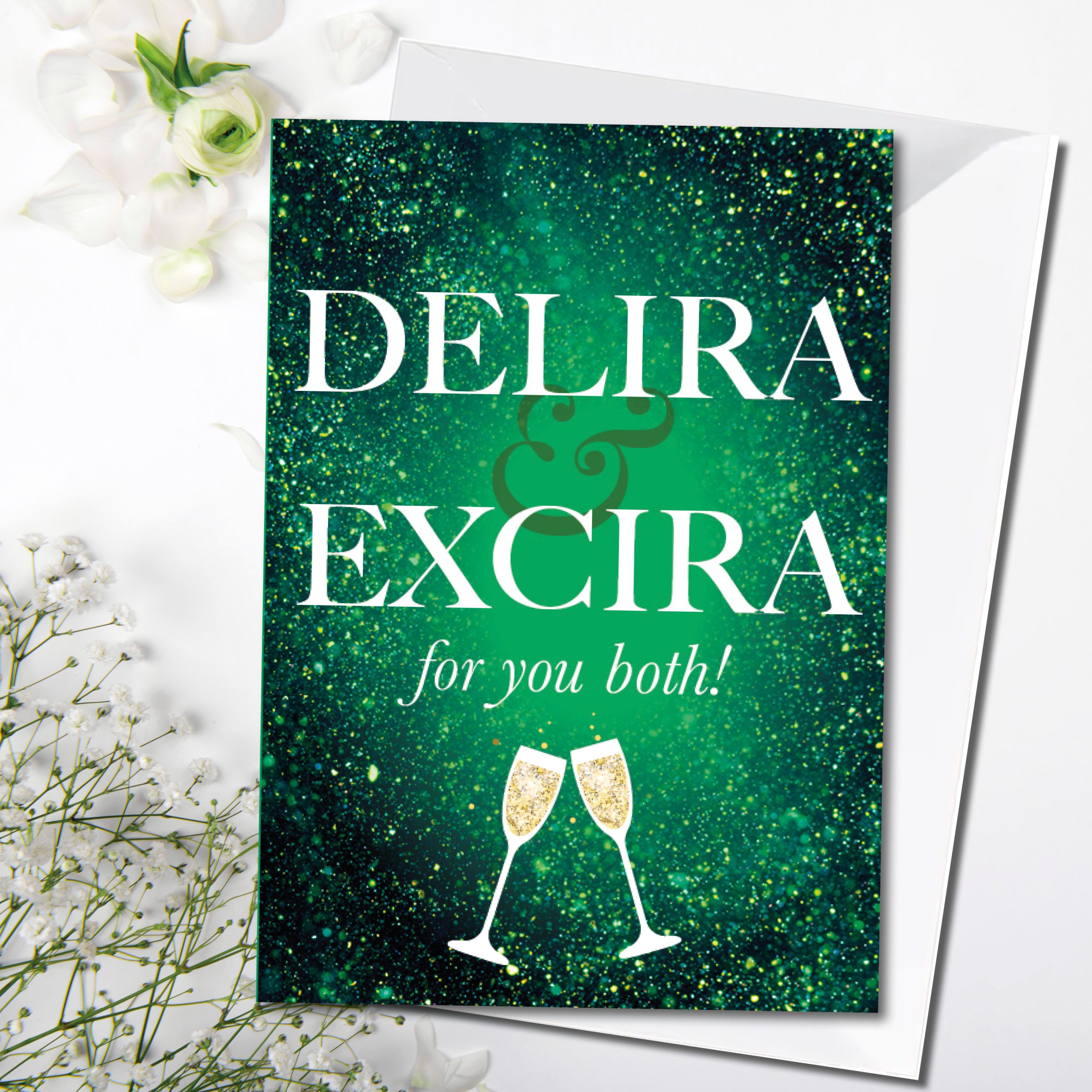 “Delira and Exira” Wedding/Engagement card. A4 folded to A5 card, blank on the inside, c0mes with white envelope.