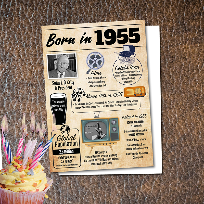 As you or your loved one celebrates their 70th birthday this year, let us take a trip down memory lane and revisit all the significant events and facts that took place in Ireland and the world during 1955. A5 folded birthday card, with craft envelope (or white). Blank inside for your greeting.